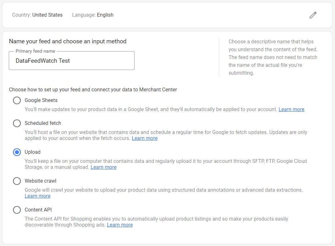- Upload your product feed file or enter a scheduled fetch URL if your feed is hosted online.