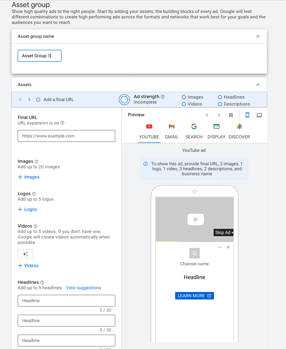 - Form an asset group with different elements like pictures, logos, videos, headlines, long headlines, descriptions, CTAs, and URLs.