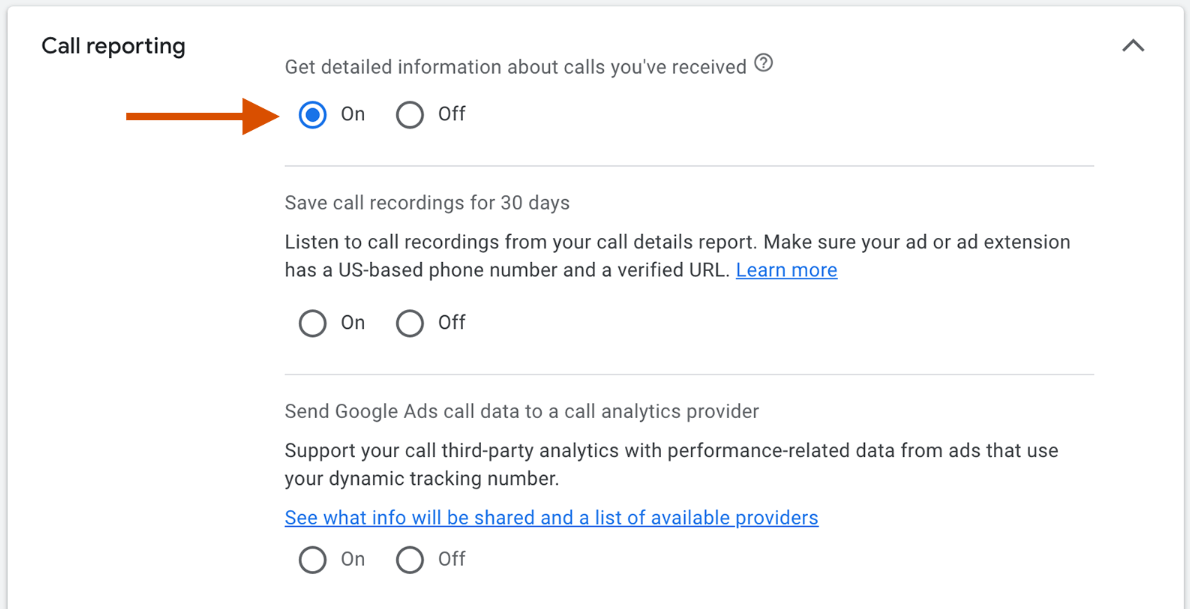 We’ll discuss what to do with the data below. Before that, turn on call reporting in your account settings. You have the option of saving call recordings to review later. You may also be able to sync call information with your preferred analytics software for additional analysis and insights.