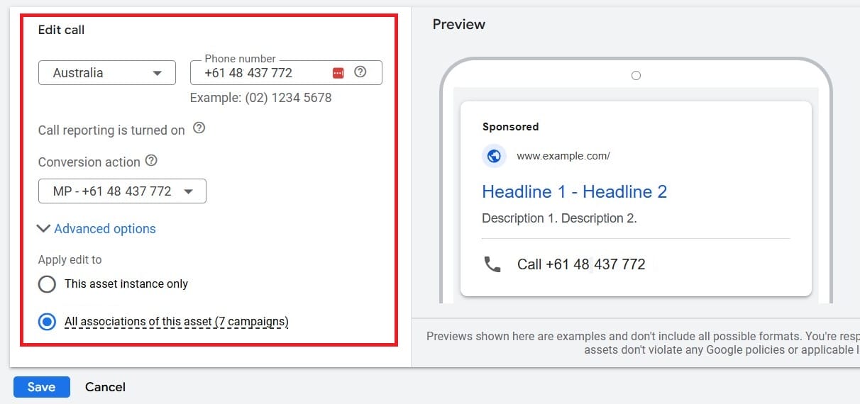 After enabling call assets, you may add them to search and PMax campaigns. Access your account’s assets and add a new call asset. Enter your phone number and associate the call conversion action that you set up earlier. As a rule, Google Ads gives out call assets at the account level. But you can opt to assign them to a specific campaign or ad group instead.