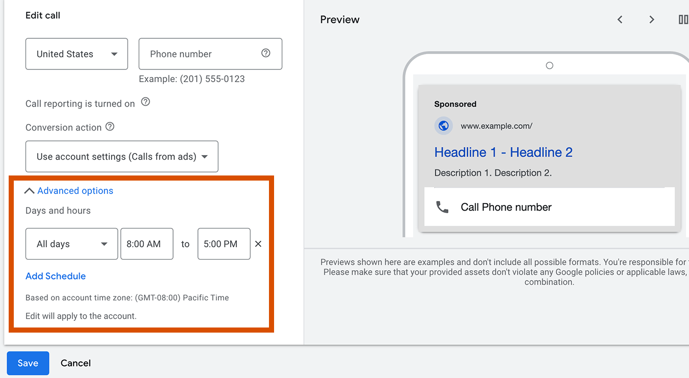 This way, your ads will still run on the campaign schedule you set. However, when call assets are not eligible to be shown, ads will instead funnel prospects to your website.