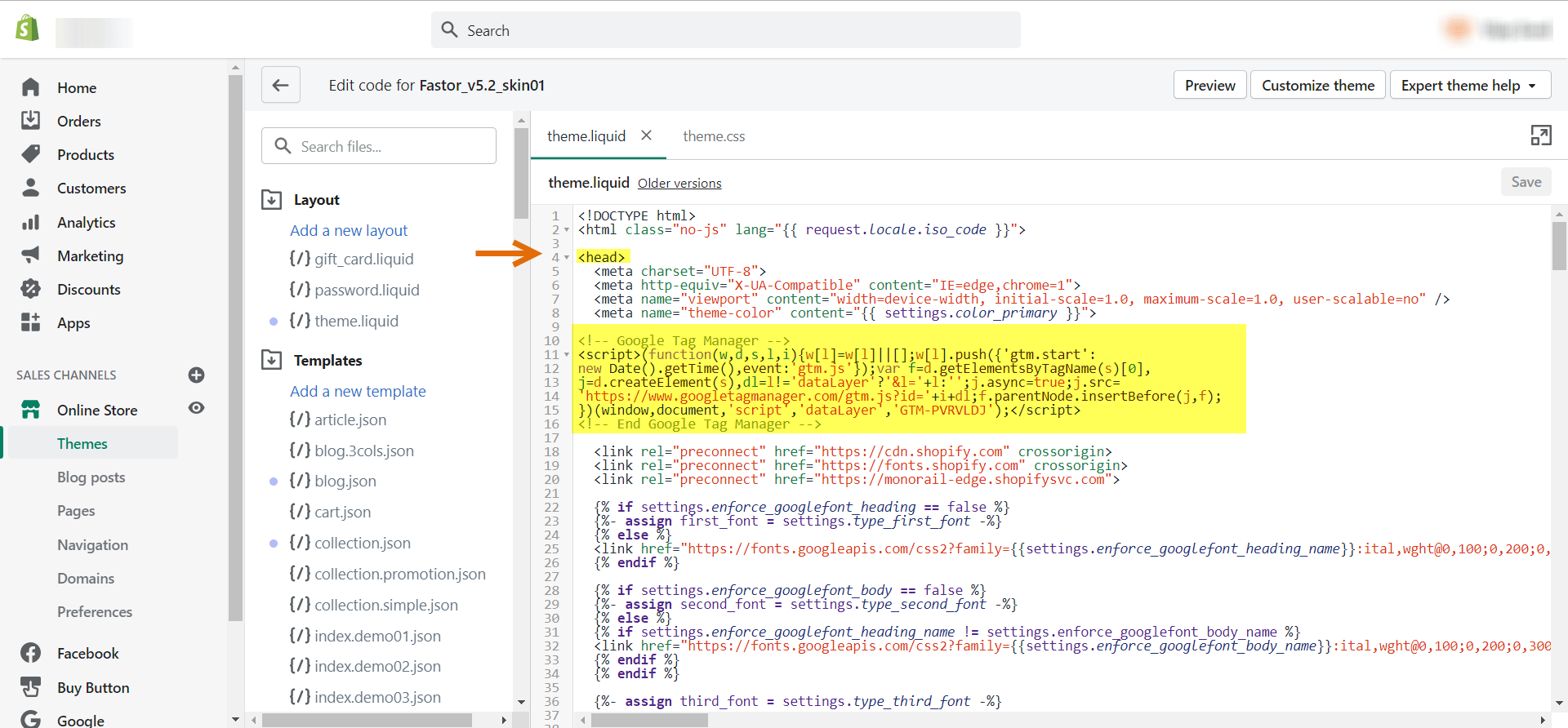 You will get two set of codes. Go to Online Store > Themes > Theme Editor > Theme.liquid file