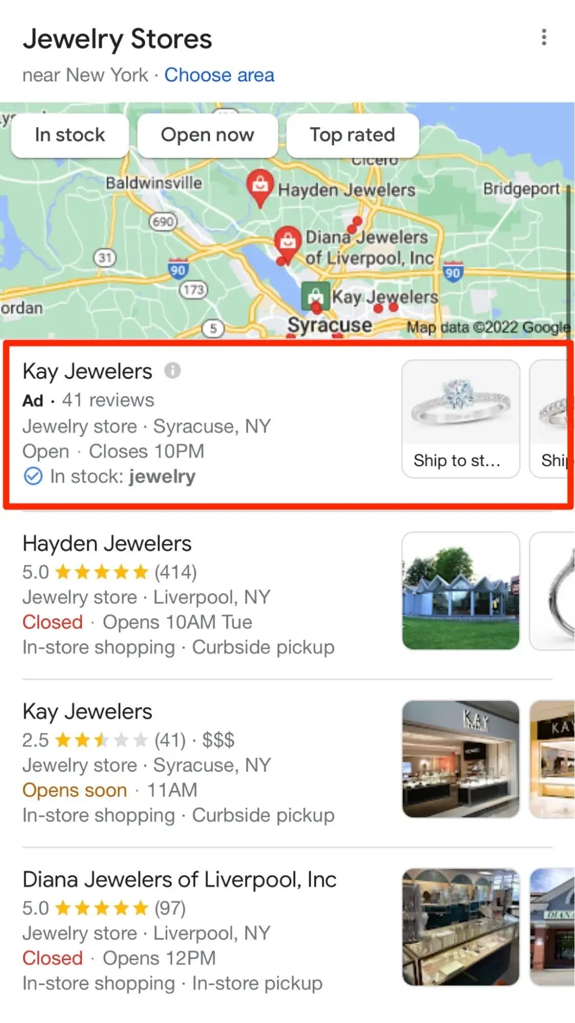 Whenever a user looks for a certain product, Google Maps shows local store results with product availability and store details.