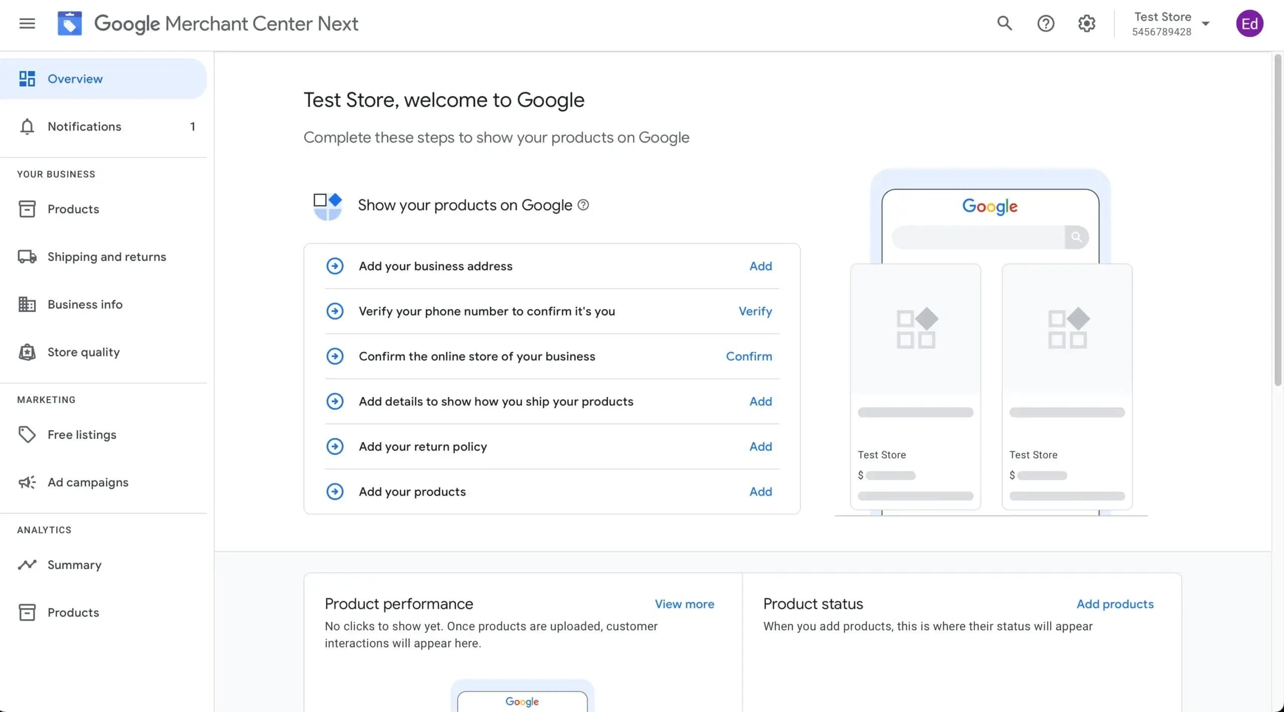 After the initial setup, register for Google Merchant Center. This part is easy since Google provides step-by-step prompts. In general, you will need to follow these steps:
