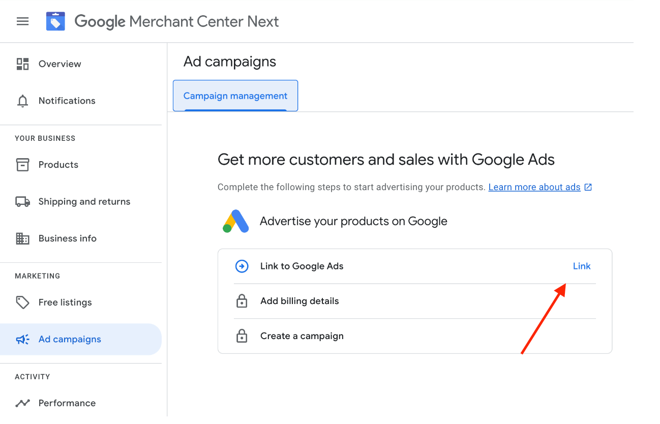 Don’t forget to link your Google Merchant Center into Google Ads for better campaign integration. When the two connect, Google learns how to turn your product info into smart and snappy ads that follow shoppers around the Google Display Network.