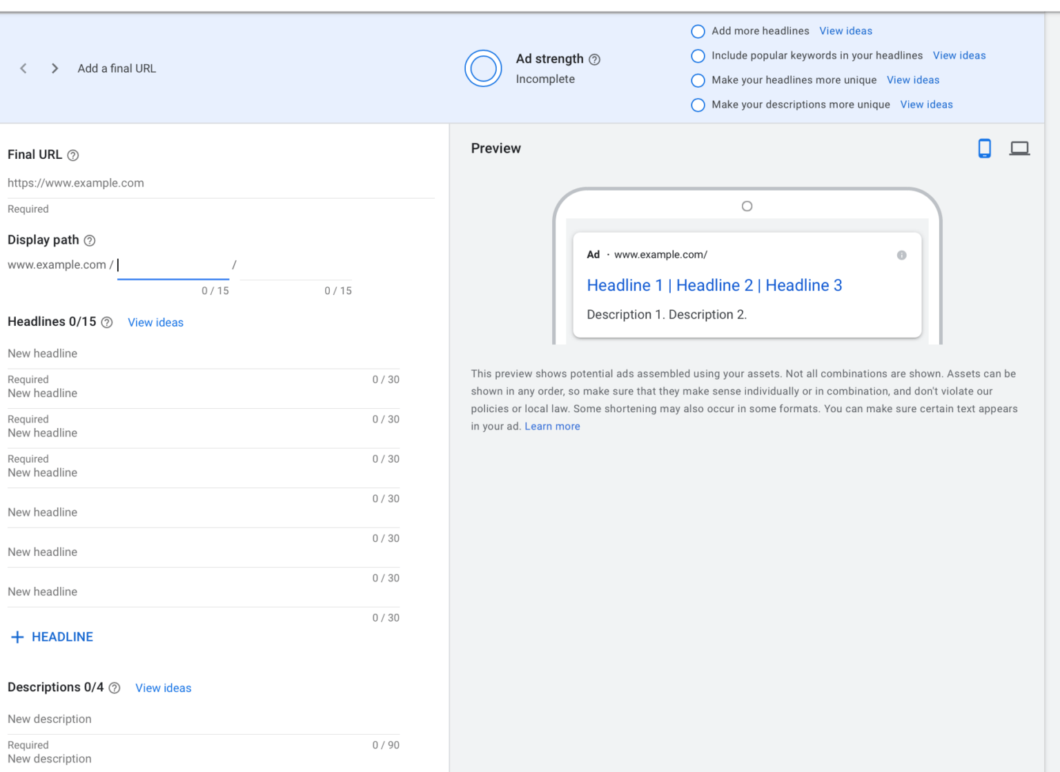 An example of one RSA may be several different headlines and descriptions, which are created to attract different audience segments.
